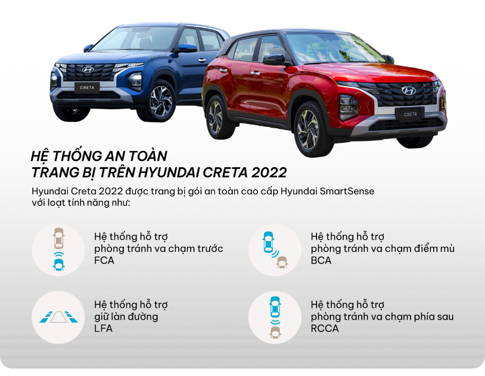 Đặc biệt về công nghệ an toàn, All New Creta 2022 được trang bị gói an toàn cao cấp Hyundai Smart Sense với hàng loạt tính năng như hệ thống hỗ trợ phòng tránh va chạm trước FCA, hệ thống hỗ trợ phòng tránh va chạm điểm mù BCA, hệ thống hỗ trợ giữ làn đường LFA, hệ thống hỗ trợ phòng tránh va chạm phía sau RCCA. Ngoài ra, trên Creta 2022 được trang bị camera lùi 360 và bộ cảm biến lùi, giúp người lái dễ dàng hơn khi lái trong thành thị. Có thể thấy Hyundai All New Creta 2022 được trang bị các tính năng an toàn của một chiếc SUV đô thị.