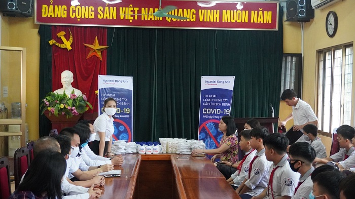 Song song với việc dạy và học, các trường học vẫn phải luôn tuân thủ các biện pháp phòng chống dịch 1 cách nghiêm ngặt. Để kịp thời hỗ trợ các trường học trên địa bàn huyện Đông Anh, ngày 01/9/2020 là dịp tập trung đầu tiên của học sinh trường THCS Nguyên Khê-Đông Anh-HN, Hyundai Đông Anh đã gửi tặng các trang thiết bị phục vụ cho việc phòng dịch như khẩu trang vải kháng khuẩn, nước rửa tay và dung dịch sát khuẩn...